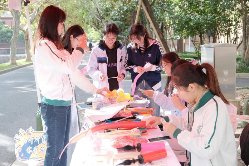 五颜六色的扭扭棒在校友手中翻飞,转眼间化作小巧的花朵、可爱的动物造型,每一件手工制品都承载着童年的纯粹与创意;拼图拼校徽环节里,校友们三五成群,凝神聚力拼接碎片,当熟悉的校徽完整呈现,往昔在校园里的求学时光也随之浮现;扎气球专区前笑语盈盈,校友们将气球扎成形态各异的作品,并纷纷合影留念。